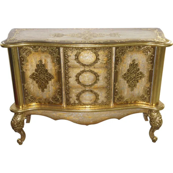 A 48" wide 3 drawer cabinet , from. Our house. Of medici collection. A collection inspired by the art. Of florence and italian renaissance grandeur. With its raised details, the hand finishing in rich jeweled tones create an interresting contrast with the varigated golds, silvers and antiquing. Hand made in mdf wood board, utilized to insure long lasting stability in all climates.