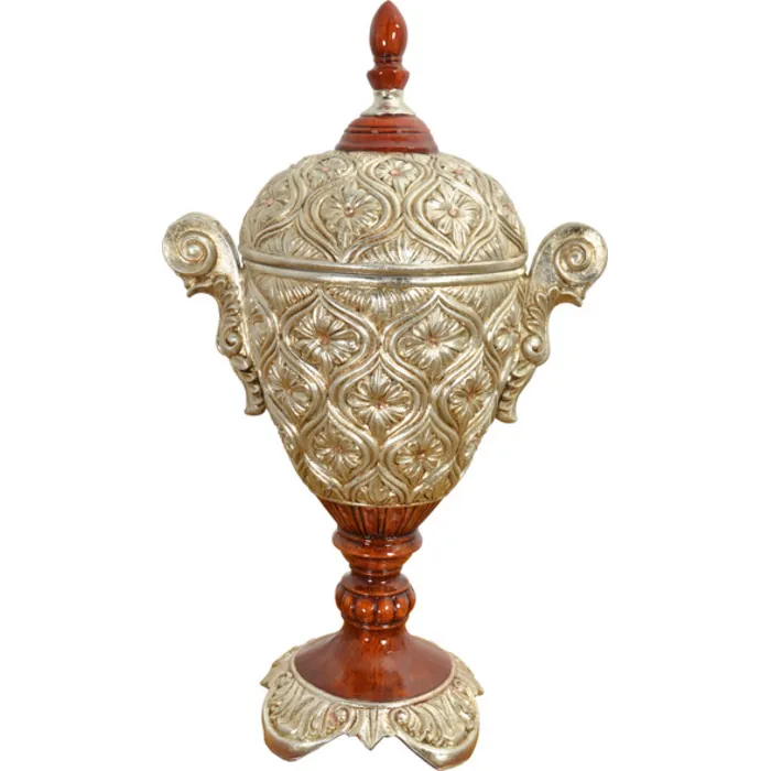 A 23" tall urn with removeable lid for additional useage as a flower vase. Or decorative storage item . This urn comes from. Our valencia collection and is part. Of a larger. Offerred valencia collection. Hand cast in resin and hand finished with a combination. Of dramatic antiqued silver leafing and lustrous hand brushed wood brown finishing. The combination is dramatic and this functional decor item will capture attention in a design setting.