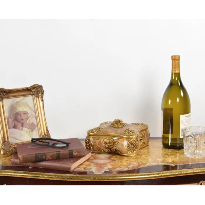 A 7.75" jewelry. Or trinket box with removeable rose handled lid, from. Our house. Of medici collection. A collection inspired by the art. Of florence and italian renaissance grandeur. With its raised details, the hand finishing in rich jeweled tones create an interresting contrast with the varigated golds, silvers and antiquing. Hand cast in resin.