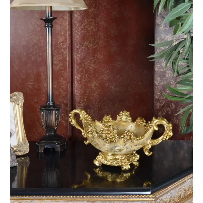 A 8" tall 15.75" wide presentation bowl , from. Our house. Of medici collection. A collection inspired by the art. Of florence and italian renaissance grandeur. With its raised details, the hand finishing in rich jeweled tones create an interresting contrast with the varigated golds, silvers and antiquing. Hand cast in resin.