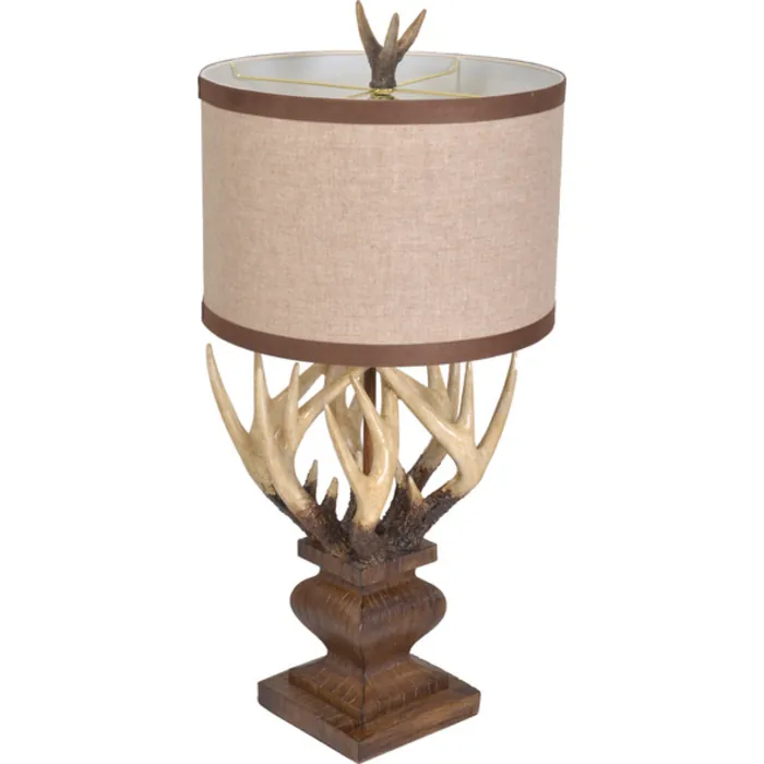 Our 33.5" tall antler lamp comes from. Our popular and growing american lodge collection. Of products and each. Of these large lamps are sold seperatley. The design was sculpted by artists depicting a natural antler and rustic wood design beneath a fitting beige linen shade with contrasting bands which brings the base and shade together nicely. The finishing is all hand done by artists and further the realistic nature. Of the lamps. Hand cast in polyresin with a metal support structure. the lamp is 110 volt , ul listed and use 1 standard e26/e27 based up to 100 watt bulb and the switch allows regular. Or. Optional 3 way bulbs. Bulbs are not included. Consider. Ordering a pair for balance. Or symetry. Or pairing with the matching antler floor lamp from the collection.