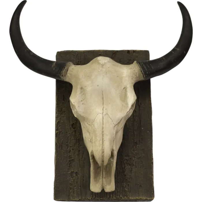 Steer skull - wall mount is 25" wide x 7" deep x 28" tall and mounts to a wall. The artist scultped design is hand cast in fiber glass reinforced resin, the hand finishing is done in mutli tones adding to the authentic look. No assembly required. The material and finish are suitable for. Outdoor use but the finish is beautiful enough for interior use as well. note* all products used. Outside will naturally wear depending. On conditions and may require maintenance.