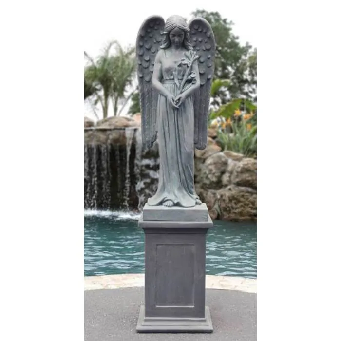 Our angel with flowers. On base stands 57" tall. The scultpure is artist carved and hand cast in a durable fiber glass reinforced resin with a finely crushed stone. Outer surface giving them an authentic hand finished stone look and lasting quality. The scultpure has an additional hand wash. Of antiqued rub that binds into the details. Of the sculpture and accents the details. The sculpture and base are separate for ease. Of transportation. The material and finish are suitable for. Outdoor use. note* all products used. Outside will naturally wear depending. On conditions and may require maintenance.