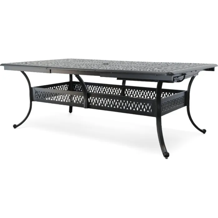The Outdoor Estate Dining Extension Table is the finest table from Bridgeton Moore Patio. Especially for settings were big is required and flexibility is even better. The table comes with 2 separately operating butterfly leaf's that allow the table to go from 84"es (7 Feet) with no leaf's open to 108 or a whopping 132"es Long fully opened. Spaciously seating 10 adults. You will like the way the exclusive butterfly mechanism allow the leaf's to store away under the table in the smoothest, quickest and easiest manner. The table is cast in All Weather Aluminum and will not rust. The table is offered in a Ebony tone finish with soft silver toned dry brushed accents. Powder coat sealing protect the finish for longest lasting outdoor use. This table is often ordered with the matching chairs consider either the Sku # 12011080 Outdoor Estate Dining Arm Chair and nicely combined with the Sku # 12011082 the Outdoor Estate Dining Swivel Arm Chair.