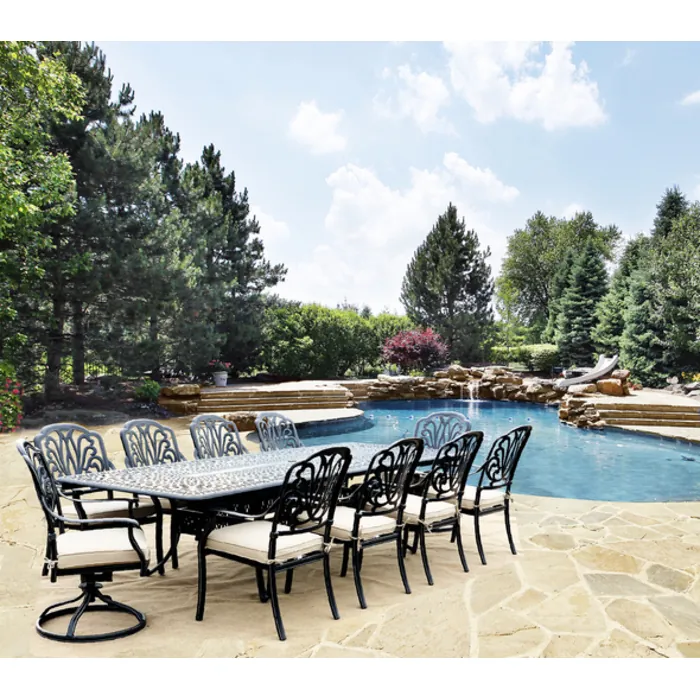 The Outdoor Estate Dining Table Set 11pc Complete, is a grand Dining Set. A special table find, for settings were big is required and flexibility is even better. The style and quality are the perfect example of bringing the beauty and designs of interior furniture and combining it with the functionality and construction of quality outdoor patio furniture. Today's designers and home owners consider the exterior of your home an extension of the interior design of your home. The Outdoor Estate Extension Table with Dining Table Chairs Set of 11 is Timeless in design, that make a quality statement in any outdoor setting. Whether relaxing with family or entertaining guests at a party this set will hold up to even the most active of lifestyles. No matter the time of year or the weather outside.