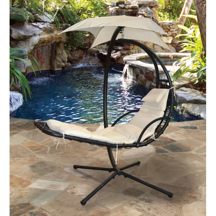 An exciting Innovation in Outdoor Lounging, The Original Trademarked Sky Lounger Beige by Bridgeton Moore is enhancing the way people relax outdoors. The patio swing lounger is sleek looking and comes fashioned with an Umbrella Awning. Best in Class Manufacturing, The Original Sky Lounger offered comes with All Weather Sumbrella Fabric on both the lounge cushion and awning. People love the modern design but even more, the relaxing comfort that's created with it's hammock style suspension seating, offering the feeling of, weightless floating in the air. Manufactured exclusively by Bridgeton Moore Outdoor Patio, our original Sky Lounger is made in heavy duty, Black Powder Coated Steel construction, and it being the only one of its kind utilizing Beige Sunbrella Fabric in both the body cushion as well as on the Umbrella. The cushion foundation uses quicker drying foam, sitting atop the weather resistant Textilene foundation. The chair design is very strong with a stable base, and safe weight recommended for up to 250 lbs. personal use. The item comes well packaged with directions for reasonable assembly. Catalog:GF-LD17815-9-B. The measurements are 76"es Wide X 41"es Deep x 80"es Height.