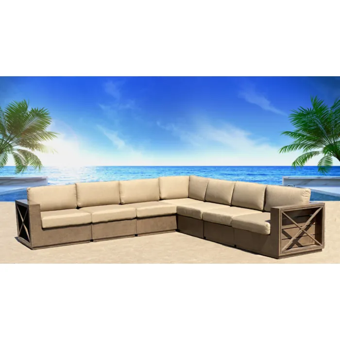 Mountain Studio Outdoor 7 Pce Sectional Set is a spectacular modern Rustic Design sectional. The 7 pce sectional is large but it is also modular, you will have flexibility on how you decide to arrange your perfect sofa. If room, the sectional can be even further enlarged and customized to your perfect size and shape with additional offerings from the Bridgeton Moore Mountain Studio's Outdoor Collection. The Mountain Studio Outdoor Collection is a pure design removed of unnecessary elements and beautifully executed. A style that elegantly blends into Nature. Not overpowering it. You will also love the quality of this Bridgeton Moore's Mountain Studio's Exclusive Collection. It is Hand crafted and Cast in 100 % Aluminum, that will never rust. Hand Finished 1 item at a time combining soft hand dry brushing and all weather powder coat finishing in a light brown Cappuccino tone. The seating is thicker and plush with seat backs and cushions covered in a neutral Linen all weather Sumbrella Fabrics. An example of bringing the beauty and designs of interior furniture and combining it with the functionality and construction of quality outdoor patio furniture. Today's designers and homeowners consider the exterior of your home an extension of the interior design of your home. Mountain Studio Outdoor Collection with its clean lines offers a minimalist contemporary design that makes a quality statement in any outdoor setting. Whether relaxing with family or entertaining guests at a party this set will hold up to even the most active of lifestyles. Consider combining it with other Offering from the Mountain Studio Outdoor Collection manufactured by Bridgeton Moore. Bridgeton Moore has established high brand quality standards and offers one of the best warranties in the Industry, 3 years on all frames and finish under normal conditions, fabrics are all Sumbrella grade and come with a manufacturers supplied two years against any manufacturing defects and or fading from date of purchase. Note * All products used outdoors require reasonable care and that level of care depends on varying external conditions. Covers are recommended for year round outdoor exposure and especially for all coastal applications. Extended exposure in coastal areas can cause corrosion and while this product is used in many coastal applications, they are voided from warranty. Simple hosing down or rinsing off salt exposure if/any will protect and extend the beautiful finish. The fabrics can be easily cleaned in a variety of ways and Sumbrella fabrics are so colorfast they can withstand even the use of bleach. No Assembly Required. Catalog: sku: 12014524