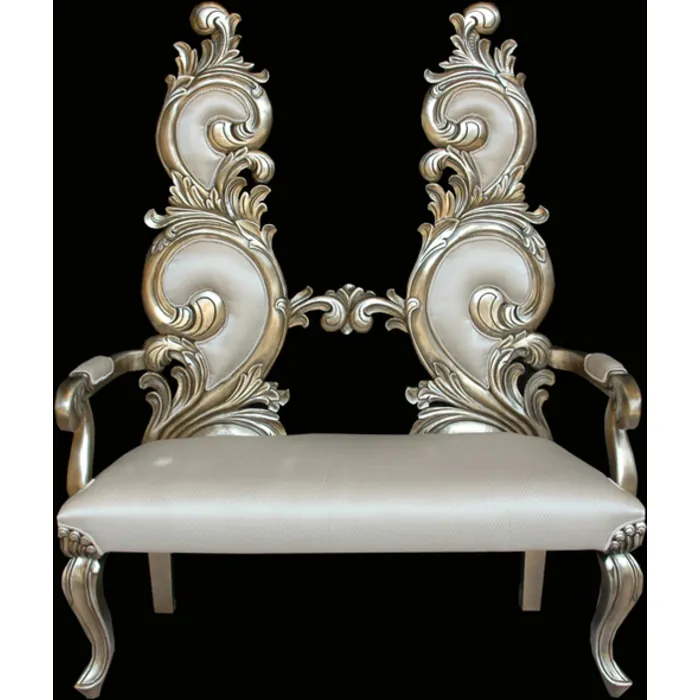 Platina Luxury Italia Settee measures 51 wide x 20 depth x 63"es tall. A beautiful example of a style of furnishings, originating in France about 1720, evolved from Baroque styling. This Rococo designed settee offers a back with symmetrical carvings that is intricately carved. The bench settee is hand carved out of solid Mahogany that is then tastefully finished in our Platina finish and upholstered with an imported Silver Taffeta fabric. Another exclusive design and finish from the Heritage Collection, a division of AFD Home. A collection of fine, hand made furniture in the purest of standards of age old traditional crafting. Each piece is hand carved, one piece at a time, by some of the world's best carvers. The special Mahogany wood comes from replanted forests. The selected wood has been kiln dried. The item in its final form is stress and pressure tested prior to finishing to ensure long lasting stability, in most climates, a Heritage Brand standard. The Platina finish series offers many accompanying items to this settee that can be considered and combined to expand your desired interior. The settee comes fully assembled, a process of finer construction offering a more stable seating. Made by hand and imported from Indonesia.
