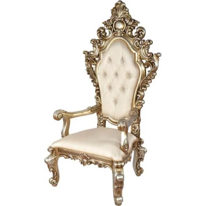 The Platine Royal Crest Chair stands 73.5"es Tall. It an impressive and opulent Throne Chair. This design is also very popular with our Wedding and Events specialists as special Wedding Throne Chairs. Hand Made and Hand Finished by the Master Carvers and Finishers of the Heritage company. Rare to find in this quality of workmanship. The Platine finish with hues of Champagne Golden Silver is equally spectacular, a multi step process of actually silver leafing the frames and layering and finishing techniques. The imported Taffeta Fabric offers a neutral balance to this amazing finishing. While this Chair is sold separately it is often ordered in pairs for Balance and Symmetry. The Platine Collection offers wonderful options to expand your design and consider any of the Platine matching Upholstery and Occasional furniture pieces from this top Quality Collection. All furniture is hand made and finished 1 piece at a time.