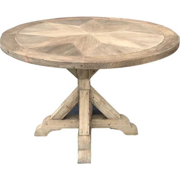 Our 48" Diameter Farmhouse Round Table is an amazing engineered table creation utilizing hand inlay. This very rare to find hand-made yet properly engineered solid wood table was proudly made possible from a lifetime of furniture manufacturing experience. The center Geometric Star design is a fine inlay of environmentally sourced Mindi wood on top of a specifically created Multiplex for a lifetime of stability. The table base and top center bands are handcrafted using reclaimed solid New Zealand Pine that is specifically hand selected, sourced, and imported for the final combined effect. The hand finishing is an open grain Farmhouse style wood finishing giving protection but maintaining the very natural effects of the reclaimed and solid woods used. Minor assembly of the top to the base allows easier placement into the home. This table pairs with many chair options as well as hutches, sideboards, consoles, kitchen islands, and many more beautiful options from the American Farmhouse Collection from Heritage, a division of AFD Home.