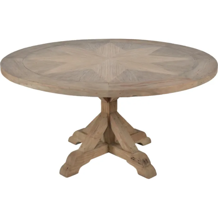 Our 60" Diameter Farmhouse Round Table is an amazing engineered table creation utilizing hand inlay. This very rare to find hand-made yet properly engineered solid wood table was proudly made possible from a lifetime of furniture manufacturing experience. The center Geometric Star design is a fine inlay of environmentally sourced Mindi wood on top of a specifically created Multiplex for a lifetime of stability. The table base and top center bands are handcrafted using reclaimed solid New Zealand Pine that is specifically hand selected, sourced, and imported for the final combined effect. The hand finishing is an open grain Farmhouse style wood finishing giving protection but maintaining the very natural effects of the reclaimed and solid woods used. Minor assembly of the top to the base allows easier placement into the home. This table pairs with many chair options as well as hutches, sideboards, consoles, kitchen islands, and many more beautiful options from the American Farmhouse Collection from Heritage, a division of AFD Home.