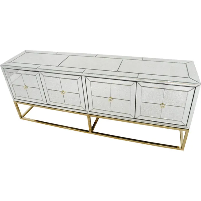 Contemporay design - marbled mirror glass with gold highlights- touch. Open doors -. One interior shelf - great for a tv platform