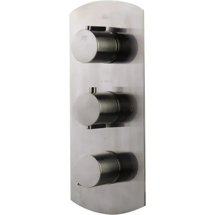 - Modern round knobs and a sleek appearance make this easy-to-install single panel shower mixer a perfect choice. Equipped with a 4-way shower diverter, this brass thermostatic shower valve mixer by ALFI brand lets you switch from your handheld showerhead or above showerhead, to tub filler or body jets any time you wish!