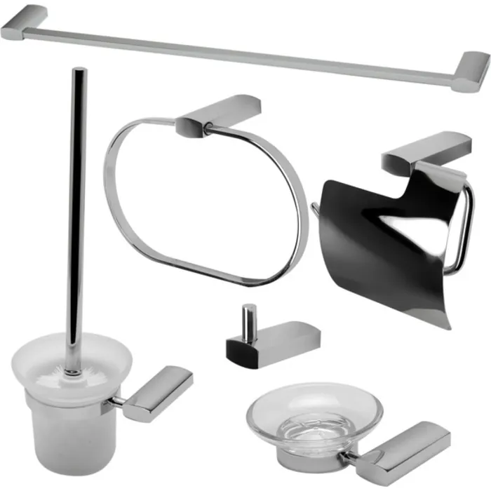 - 6 Piece Set Includes: Towel Bar, Towel Ring, Robe Hook, Soap Dish, Toilet Brush Holder & Toilet Paper Holder.