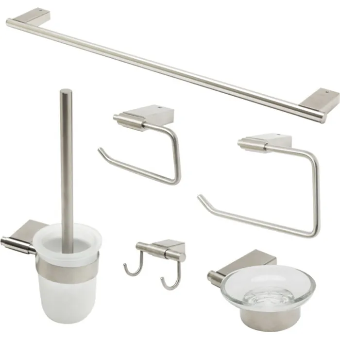 - 6 Piece Set Includes: Towel Bar, Towel Ring, Robe Hook, Soap Dish, Toilet Brush Holder & Toilet Paper Holder.