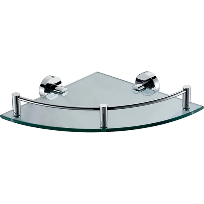 - Includes one corner mounted rounded clear glass shelf with chrome accents.