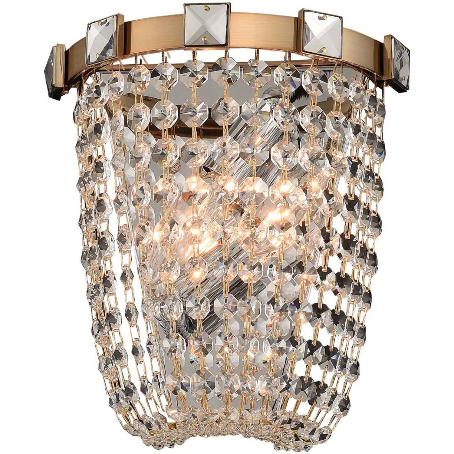 A modern take on a classic empire inspired frame, features include a brush champagne gold finish, faceted square jewels embedded on the gallery and graduated jewels for a full array of crystals that help conceal the light source.2 Light Wall SconceE12 Candelabra0Dimmable: YesDimmer Type: Refer to bulb manufacturer for compatibilitySockets: 2Wattage: 60Lamp Type: E12 CandelabraBulbs Incl#: NoMax Height: 9