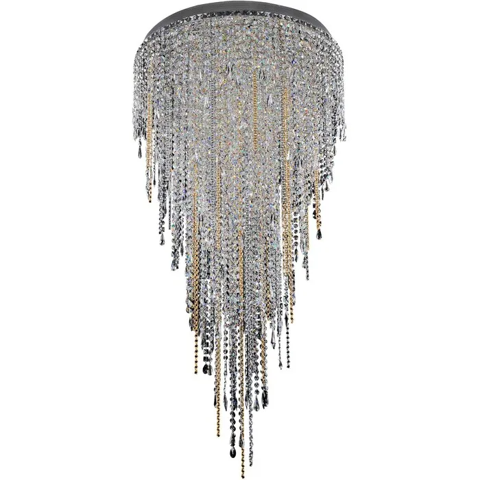 Designed for maximum visual impact, the Tenuta Collection can transform a room from lackluster to luxurious. Vintage style is effortlessly contained in the cascade of mixed shape clear Firenze crystals and gold, silver jewelry chains that fall from the po32" Convertible Pendant - Flush MountGU100Dimmable: YesDimmer Type: Refer to bulb manufacturer for compatibilitySockets: 16Wattage: 50Lamp Type: GU10Bulbs Incl#: NoMax Height: 60