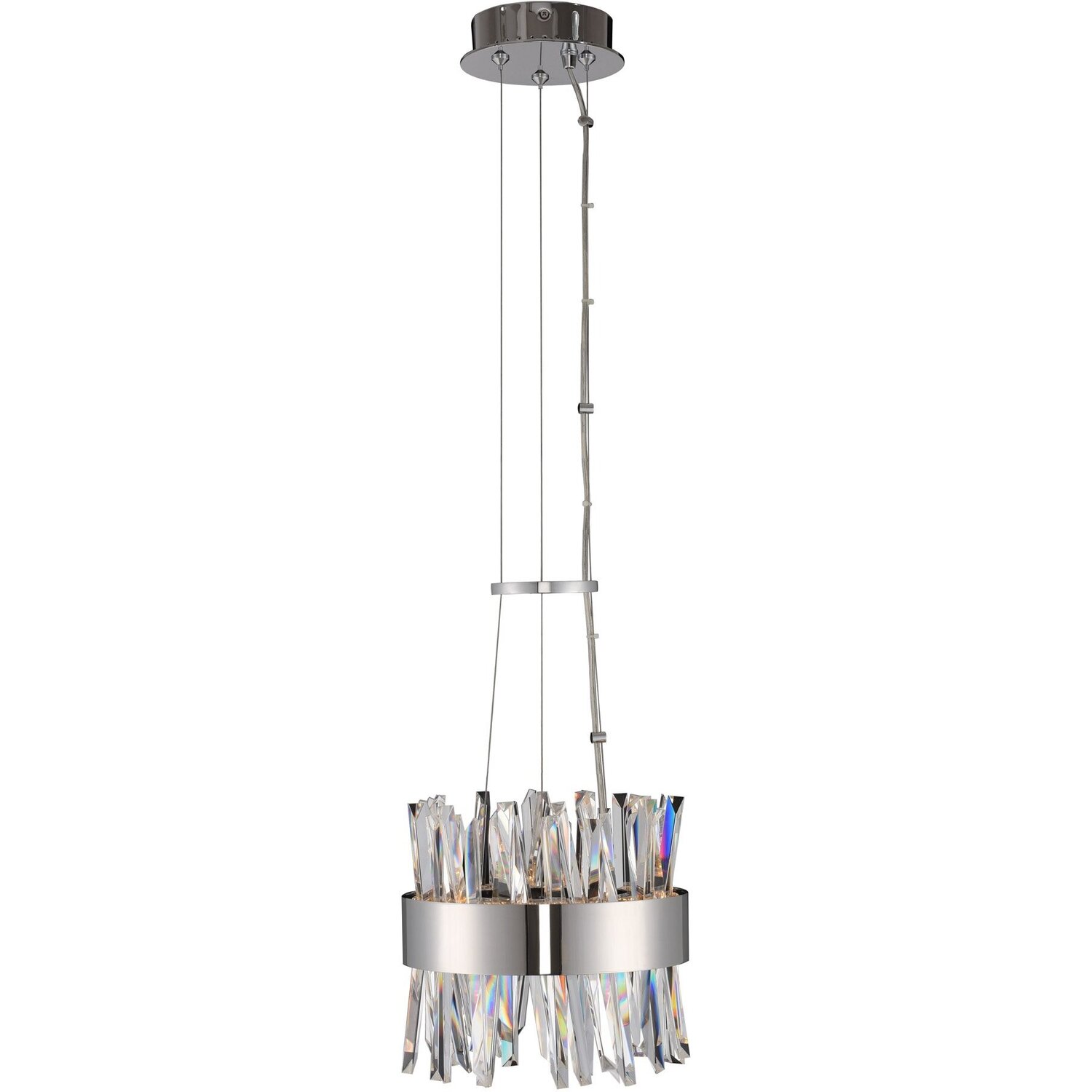 Glacier is the only way to describe this eye catching series. Polished Chrome or Brushed Champagne Gold frames are backlit by LED Lighting and spears of Ice Shaped Crystals which make this one of the unique light forms in the market. Available in Polishe10" LED Mini PendantLED0Dimmable: YesDimmer Type: ELV (not included)Wattage: 26Lamp Type: LEDColor Rendering Index (CRI): 80Bulbs Incl#: YesCorrelated Color Temperature (K): 2700Lumens (Lm): 2340