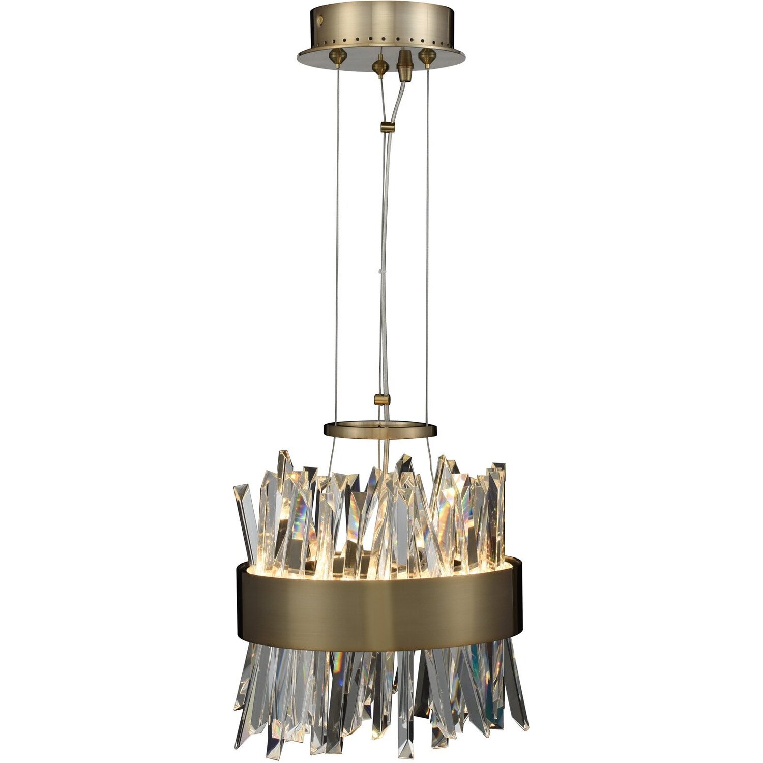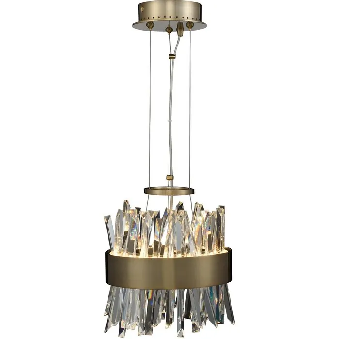 Glacier is the only way to describe this eye catching series. Polished Chrome or Brushed Champagne Gold frames are backlit by LED Lighting and spears of Ice Shaped Crystals which make this one of the unique light forms in the market. Available in Polishe10" LED Mini PendantLEDPendant0Dimmable: YesDimmer Type: ELV (not included)Wattage: 26Lamp Type: LEDColor Rendering Index (CRI): 80Bulbs Incl#: YesCorrelated Color Temperature (K): 2700Lumens (Lm): 2340