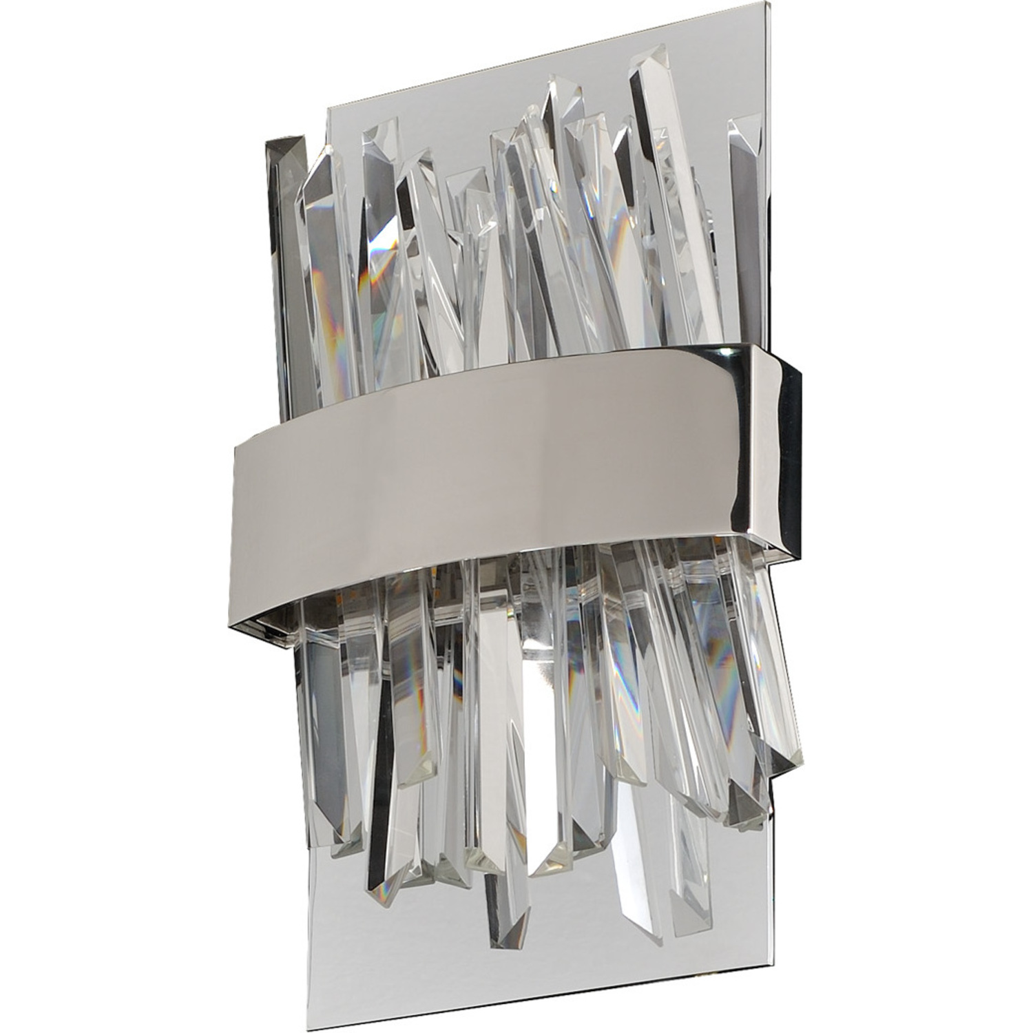Glacier is the only way to describe this eye catching series. Polished Chrome or Brushed Champagne Gold frames are backlit by LED Lighting and spears of Ice Shaped Crystals which make this one of the unique light forms in the market. Available in PolisheLED Wall BracketLED0Dimmable: YesDimmer Type: ELV (not included)Wattage: 6Lamp Type: LEDColor Rendering Index (CRI): 80Bulbs Incl#: YesCorrelated Color Temperature (K): 2700Lumens (Lm): 720