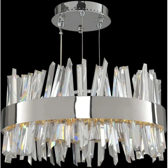 Glacier is the only way to describe this eye catching series. Polished Chrome or Brushed Champagne Gold frames are backlit by LED Lighting and spears of Ice Shaped Crystals which make this one of the unique light forms in the market. Available in Polishe20" LED PendantLED0Dimmable: YesDimmer Type: ELV (not included)Wattage: 56Lamp Type: LEDColor Rendering Index (CRI): 80Bulbs Incl#: YesCorrelated Color Temperature (K): 2700Lumens (Lm): 5220