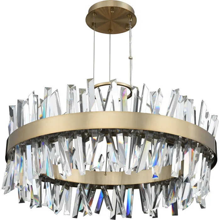 Glacier is the only way to describe this eye catching series. Polished Chrome or Brushed Champagne Gold frames are backlit by LED Lighting and spears of Ice Shaped Crystals which make this one of the unique light forms in the market. Available in Polishe32" Round LED PendantLEDFoyer0Dimmable: YesDimmer Type: ELV (not included)Wattage: 94Lamp Type: LEDColor Rendering Index (CRI): 80Bulbs Incl#: YesCorrelated Color Temperature (K): 2700Lumens (Lm): 8460