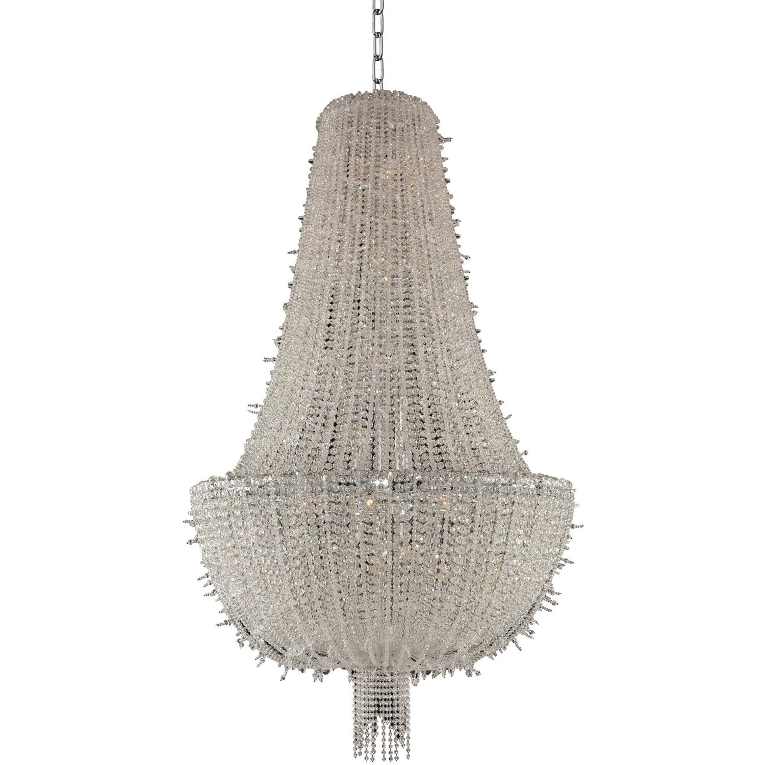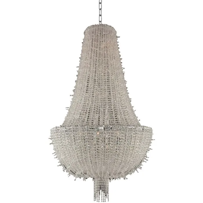 A modern take on a classic empire shaped chandelier. Our version features multi layers of delicately draped crystals for a full and dimensional brilliant ice like glow. Works in a modern, classic or shabby chic environment. Designed with your lifestyle38" PendantE12 Candelabra0Dimmable: YesDimmer Type: Refer to bulb manufacturer for compatibilitySockets: 20Wattage: 60Lamp Type: E12 CandelabraBulbs Incl#: NoMax Height: 69