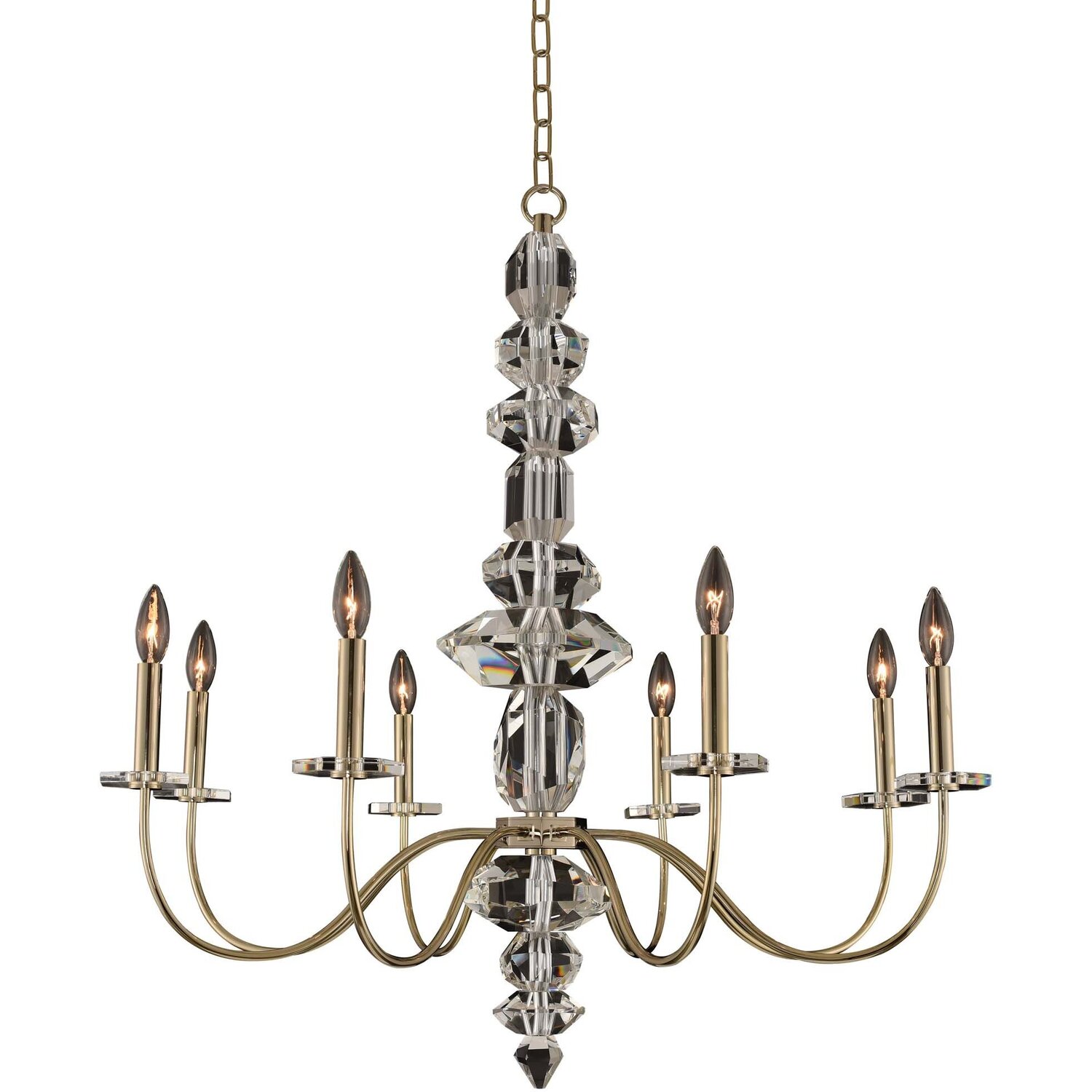 Sculptural take on a traditional chandelier. The framework features organically cut clear crystal column and a sleek Champagne Gold finish.8 Light ChandelierE12 Candelabra0Dimmable: YesDimmer Type: Refer to bulb manufacturer for compatibilitySockets: 8Wattage: 60Lamp Type: E12 CandelabraBulbs Incl#: NoMax Height: 36