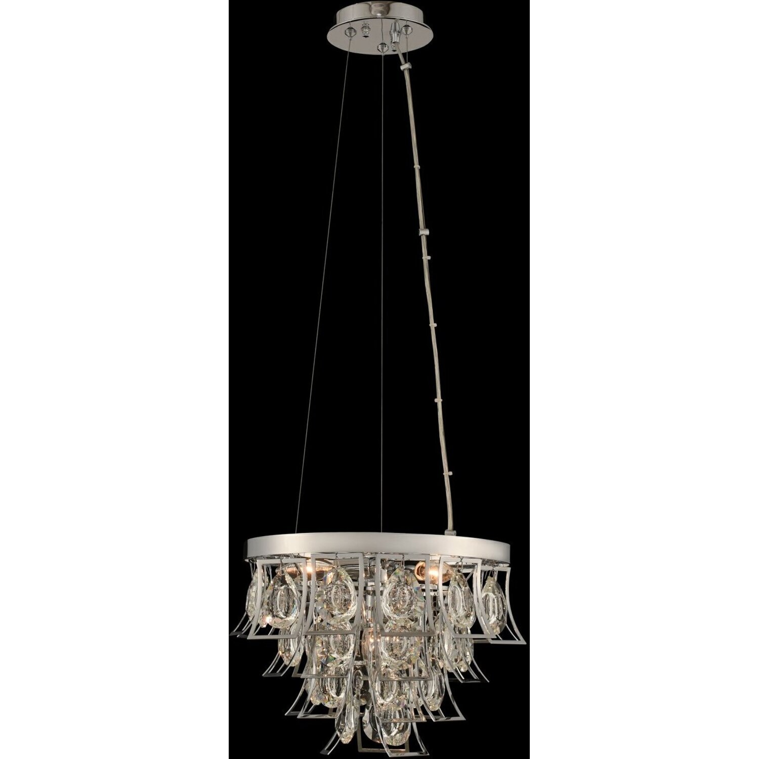 A faceted teardrop and concave crystal is suspended within a curved shadow box. Featuring a tapered waterfall styled frame is available in polished chrome or a brushed brass finish. It is sure to be the center of attention in any modern décor.14" Adjustable PendantE12 Candelabra0Dimmable: YesDimmer Type: Refer to bulb manufacturer for compatibilitySockets: 4Wattage: 60Lamp Type: E12 CandelabraBulbs Incl#: NoMax Height: 11