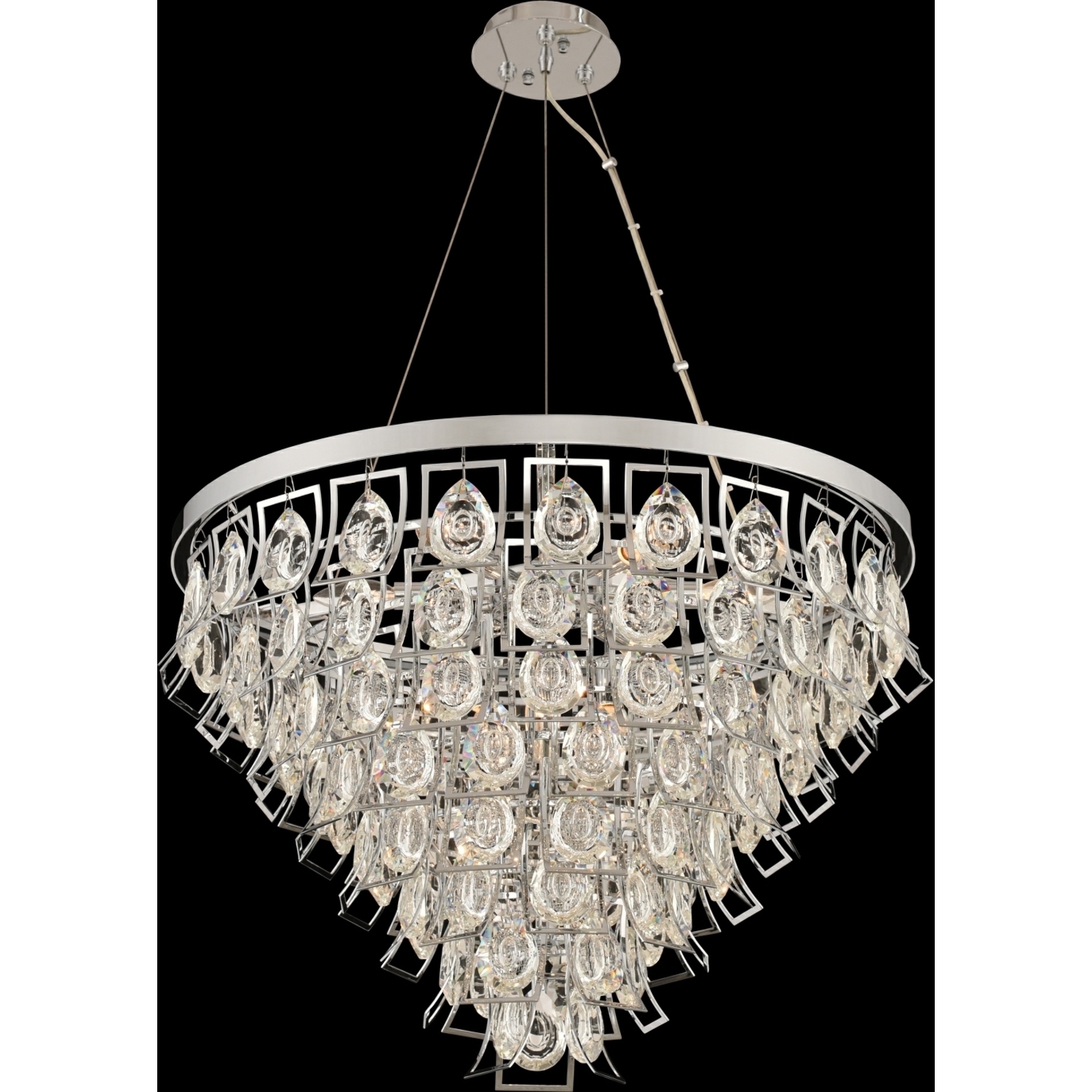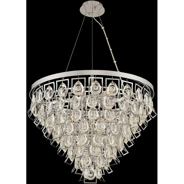 A faceted teardrop and concave crystal is suspended within a curved shadow box. Featuring a tapered waterfall styled frame is available in polished chrome or a brushed brass finish. It is sure to be the center of attention in any modern décor.27" Adjustable PendantE12 Candelabra0Dimmable: YesDimmer Type: Refer to bulb manufacturer for compatibilitySockets: 9Wattage: 60Lamp Type: E12 CandelabraBulbs Incl#: NoMax Height: 19