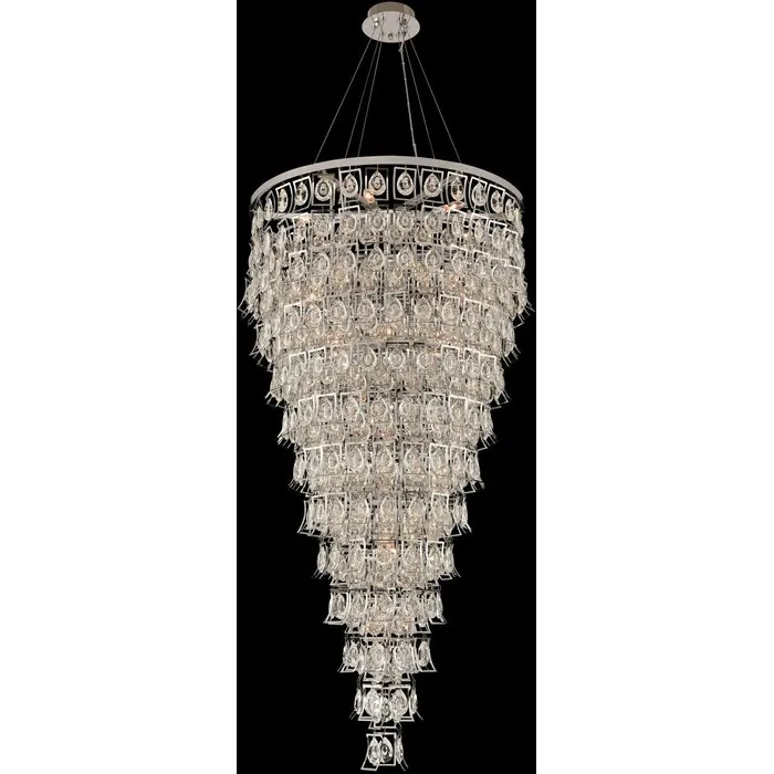 A faceted teardrop and concave crystal is suspended within a curved shadow box. Featuring a tapered waterfall styled frame is available in polished chrome or a brushed brass finish. It is sure to be the center of attention in any modern décor.36" Foyer PendantE12 Candelabra0Dimmable: YesDimmer Type: Refer to bulb manufacturer for compatibilitySockets: 28Wattage: 60Lamp Type: E12 CandelabraBulbs Incl#: NoMax Height: 70
