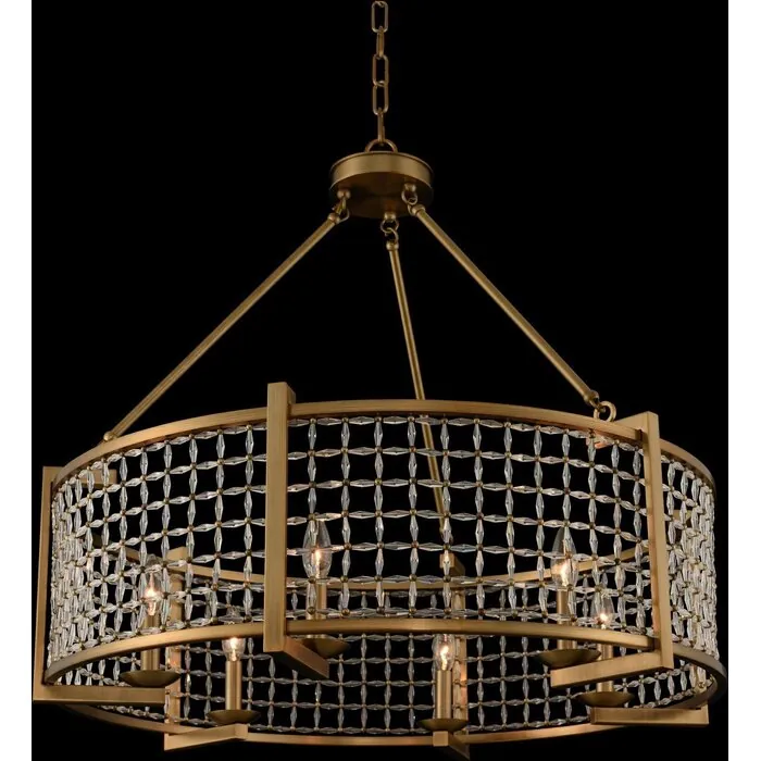 Featured in a brushed pearlized brass finish with a crystal mesh draping that is free flowing. The lighting is integrated into the frame to give a warm and open feeling to the center of the fixture creating an open-air environment. A unique approach to 36" PendantE12 Candelabra0Dimmable: YesDimmer Type: Refer to bulb manufacturer for compatibilitySockets: 6Wattage: 60Lamp Type: E12 CandelabraBulbs Incl#: NoMax Height: 31