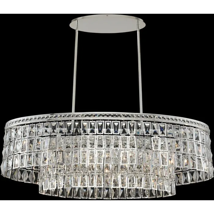Art Deco inspired Kasturi Collection features tiered crystal layers and jewelled bands with alternating frames that cradle individual crystals for added dimension. Offered in a sexy Silver finish.42" IslandE12 CandelabraPendantIncludes (2) 6" (2) 12" and (2) 24" StemsDimmable: YesDimmer Type: Refer to bulb manufacturer for compatibilitySockets: 6Wattage: 40Lamp Type: E12 CandelabraColor Rendering Index (CRI): 100Bulbs Incl#: NoMax Height: 15