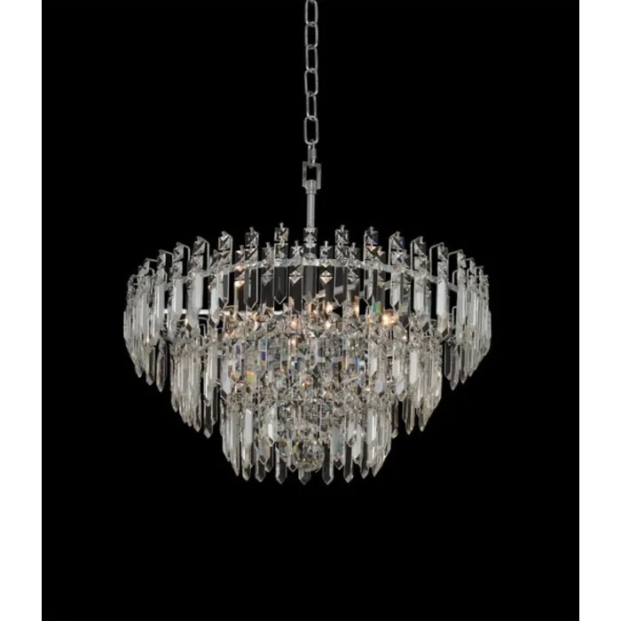 The Pandoro Collection features edgy Firenze Crystal Spears and Squares in multi tier shapes with a Polished Chrome finish.21" Convertible Pendant - Flush MountE12 CandelabraSemi Flush Mount0Dimmable: YesDimmer Type: Refer to bulb manufacturer for compatibilitySockets: 6Wattage: 60Lamp Type: E12 CandelabraBulbs Incl#: NoMax Height: 19