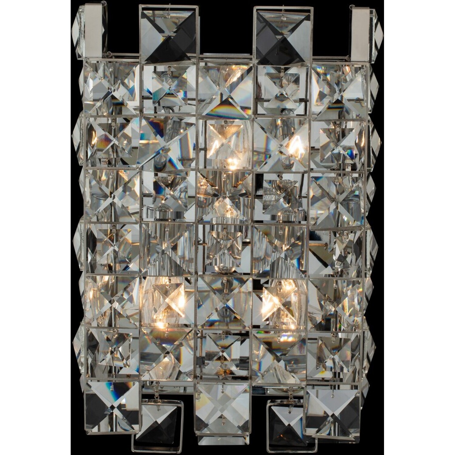 Faceted crystal squares are placed in a checkered pattern inside of a Brushed Champagne Gold frame in the Piazze Collection. The use of negative space creates a visually light look that would work perfectly in formal or more casual setting.9" Wall SconceE12 CandelabraBath0Dimmable: YesDimmer Type: Refer to bulb manufacturer for compatibilitySockets: 3Wattage: 40Lamp Type: E12 CandelabraBulbs Incl#: NoMax Height: 14