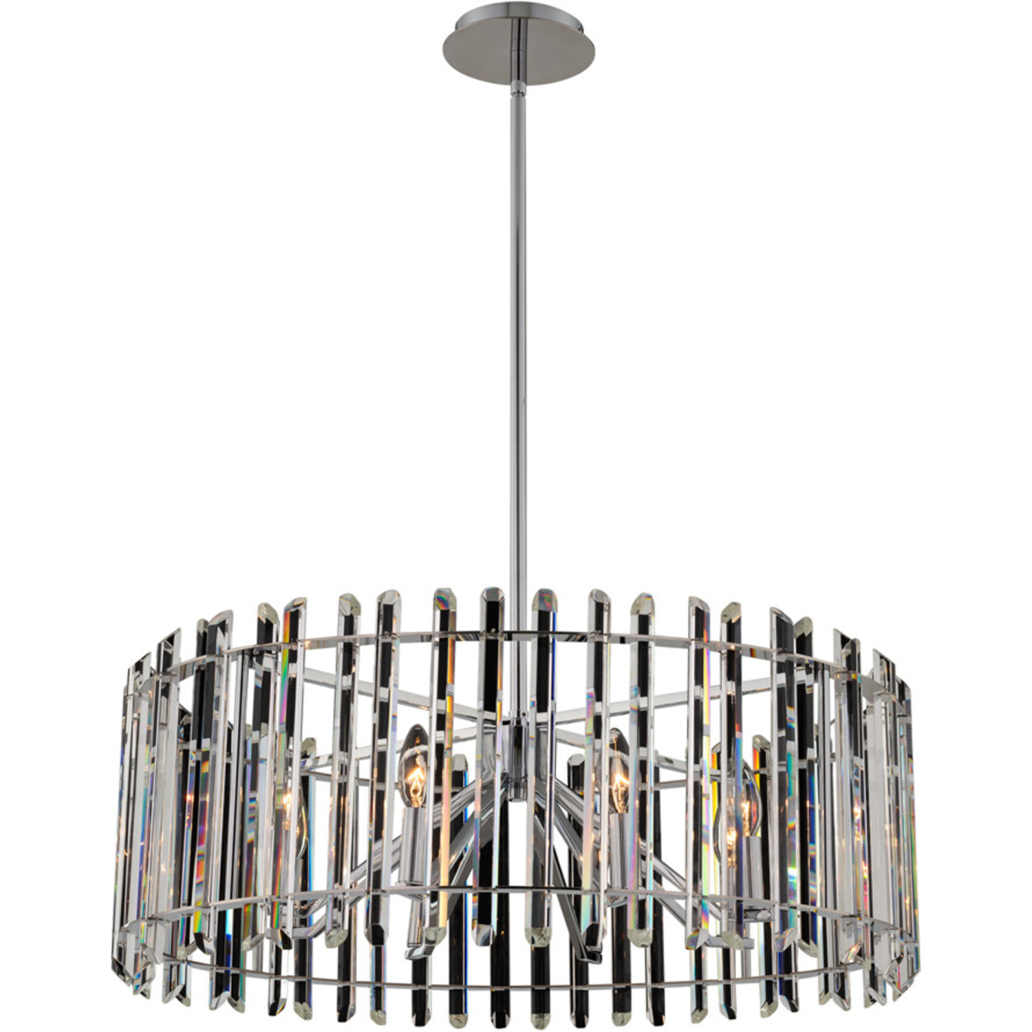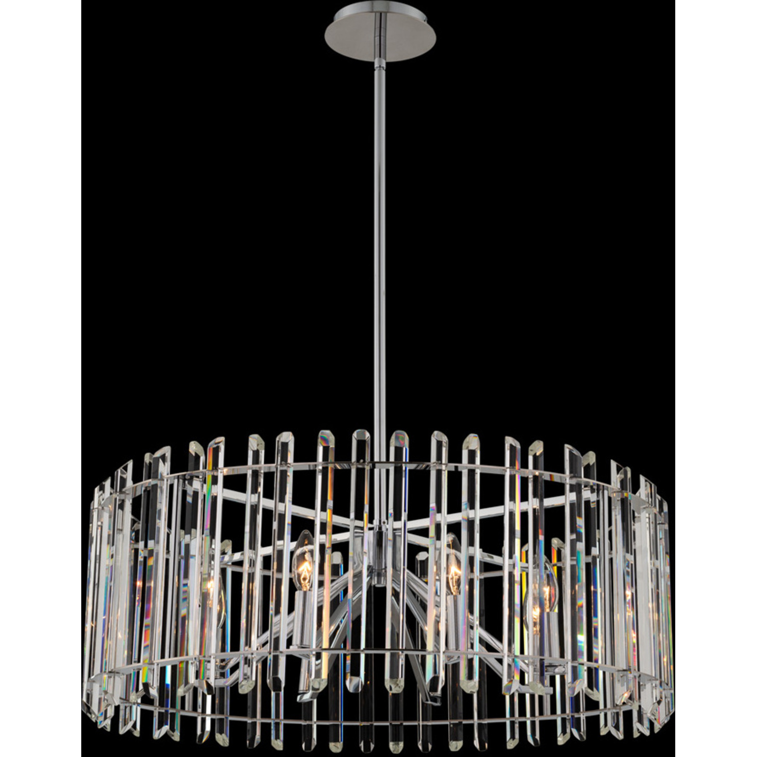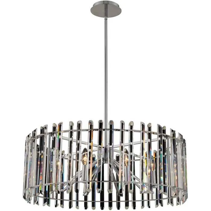 Viano's hexagonal crystal bars are suspended in the air by two Chrome (010) laser cut rings. Viano is light and airy yet it will be a statement piece in your space. Crystals slide into the stainless steel frame for easy installation and maintenance.28" PendantCand.ChandelierIncludes (1) 6" (1) 12" and (1) 24" StemsDimmable: YesDimmer Type: Refer to bulb manufacturer for compatibilitySockets: 8Wattage: 40Lamp Type: Cand.Bulbs Incl#: NoMax Height: 19