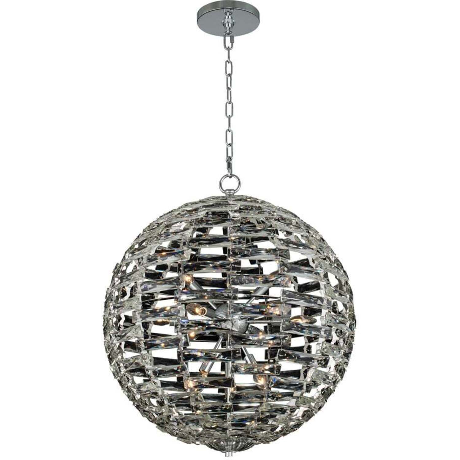 The Alta Collection is made of many crystal bars carefully arranged to make a perfect sphere crystal diffuser. Inside the Chrome (010) frame a sputnik light cluster adds an inner layer. The Alta is a great center piece in any room.36" Orb PendantE12 CandelabraChandelier0Dimmable: YesDimmer Type: Refer to bulb manufacturer for compatibilitySockets: 16Wattage: 40Lamp Type: E12 CandelabraBulbs Incl#: NoMax Height: 39