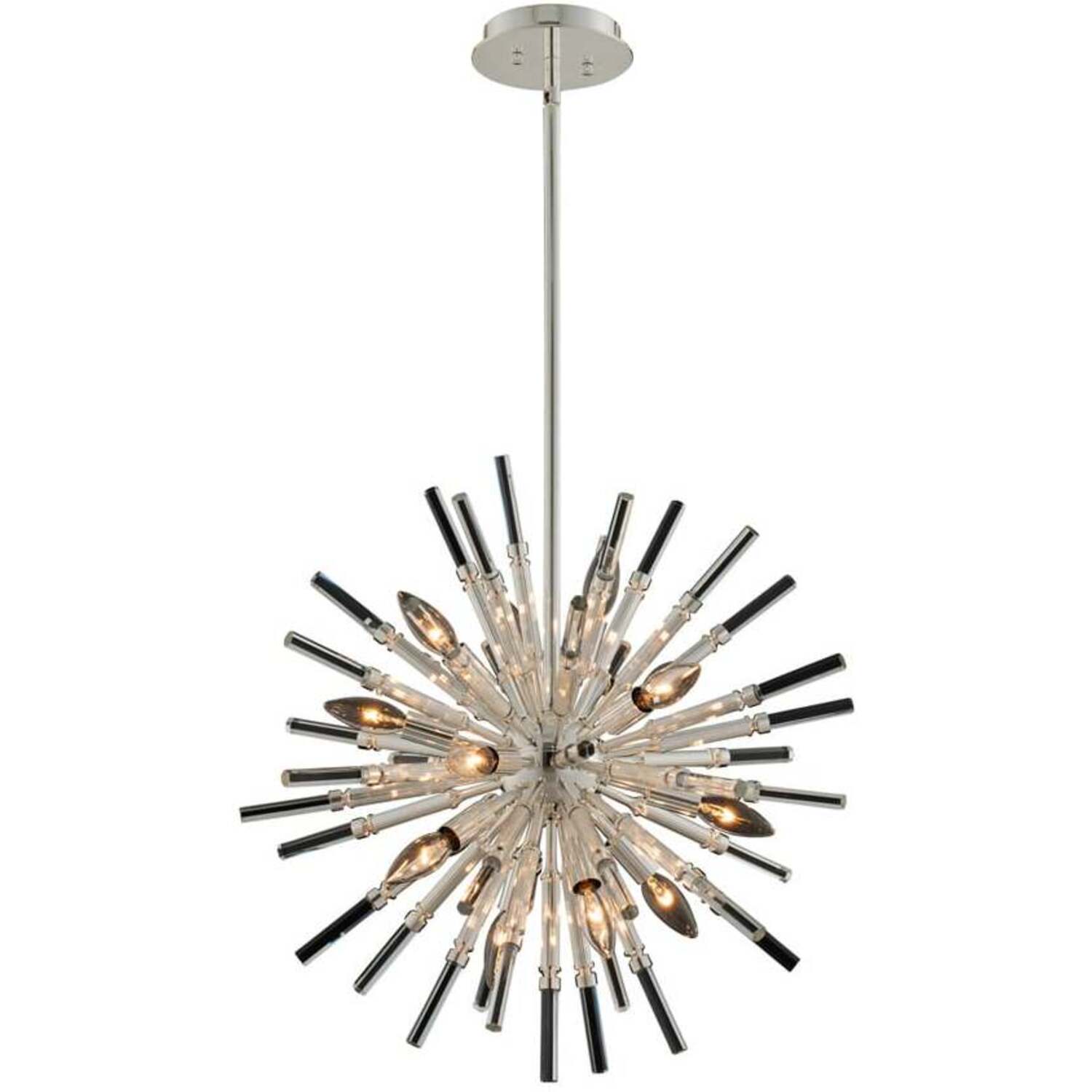 The Sprazzo Collection is a contemporary sputnik chandelier with classic art deco elements. Sprazzo is new and sleek yet nostalgic, and comes in a Polished Silver (014) finish.22" PendantE12 CandelabraChandelier1x6 1x12 1x24Dimmable: YesDimmer Type: Refer to bulb manufacturer for compatibilitySockets: 14Wattage: 40Lamp Type: E12 CandelabraBulbs Incl#: NoMax Height: 28