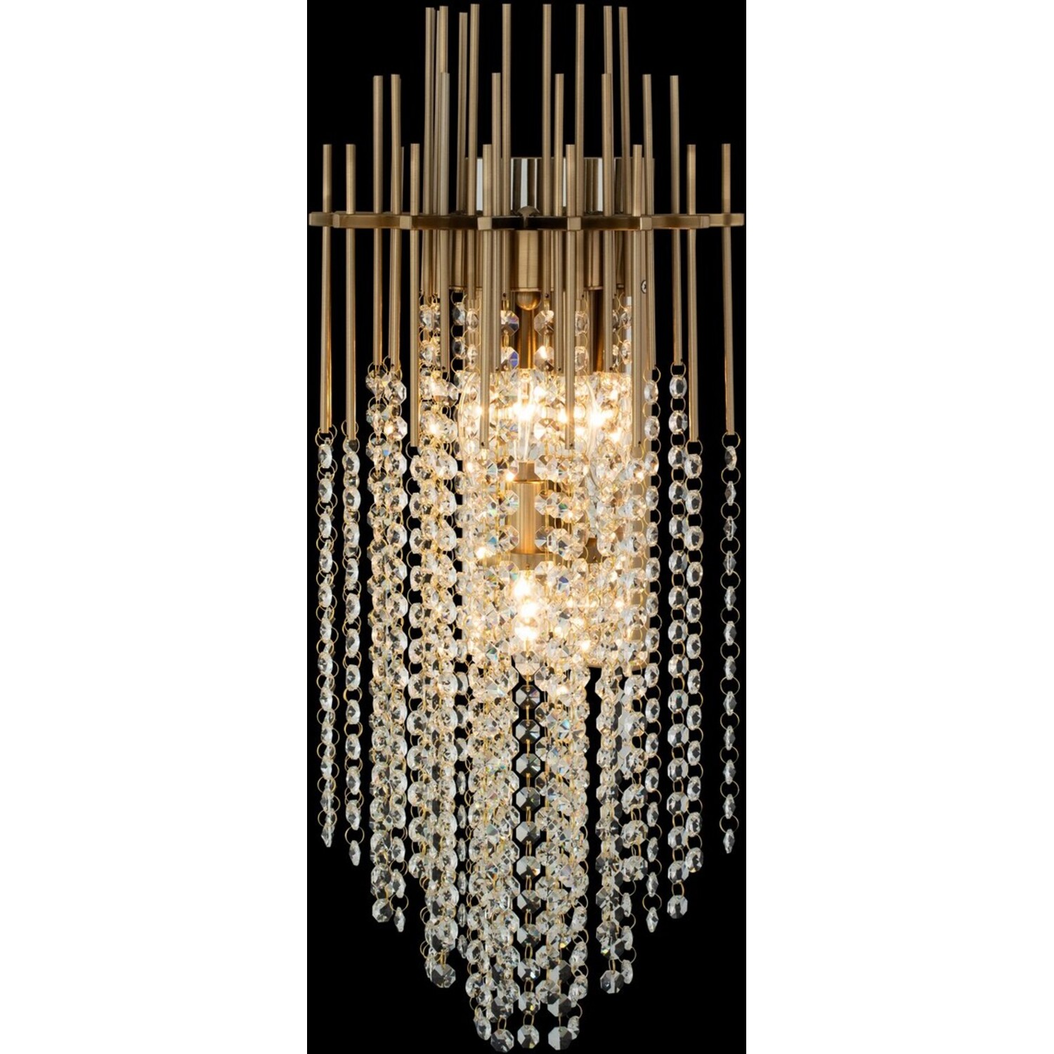 In the Estrella Collection, many slender metal rods in a Brushed Champagne Gold finish hold strands of delicate faceted crystal beads for a look that's dramatic and artistic. Estrella would bring a glamorous warmth to a modern home.10" Wall SconceE12 CandelabraBath0Dimmable: YesDimmer Type: Refer to bulb manufacturer for compatibilitySockets: 3Wattage: 40Lamp Type: E12 CandelabraBulbs Incl#: NoMax Height: 24