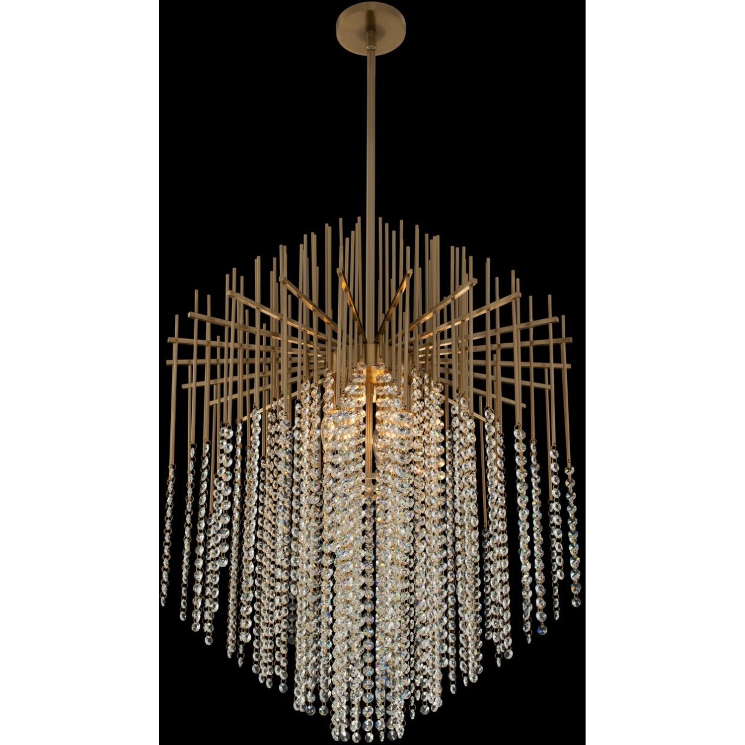 In the Estrella Collection, many slender metal rods in a Brushed Champagne Gold finish hold strands of delicate faceted crystal beads for a look that's dramatic and artistic. Estrella would bring a glamorous warmth to a modern home.26" PendantE12 CandelabraChandelierIncludes (1) 6" (1) 12" and (1) 24" StemsDimmable: YesDimmer Type: Refer to bulb manufacturer for compatibilitySockets: 6Wattage: 40Lamp Type: E12 CandelabraBulbs Incl#: NoMax Height: 39