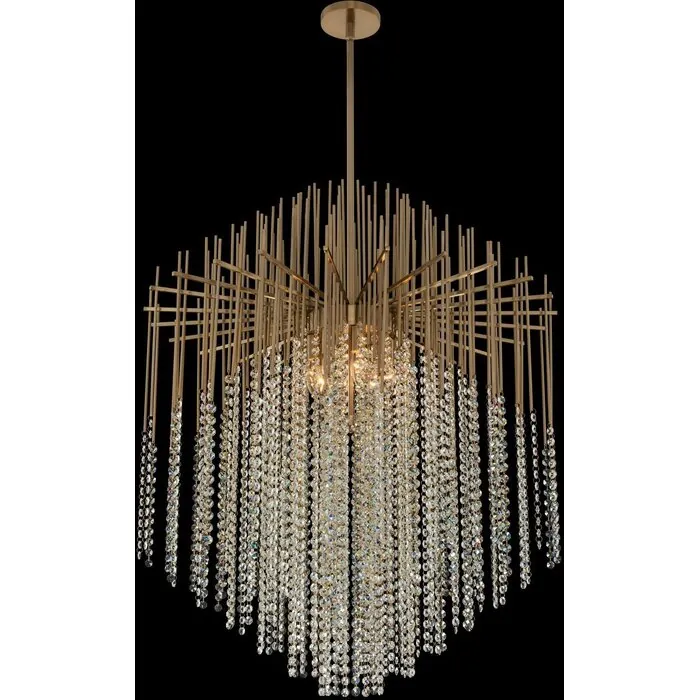 In the Estrella Collection, many slender metal rods in a Brushed Champagne Gold finish hold strands of delicate faceted crystal beads for a look that's dramatic and artistic. Estrella would bring a glamorous warmth to a modern home.32" PendantE12 CandelabraChandelierIncludes (1) 6" (1) 12" and (1) 24" StemsDimmable: YesDimmer Type: Refer to bulb manufacturer for compatibilitySockets: 8Wattage: 40Lamp Type: E12 CandelabraBulbs Incl#: NoMax Height: 44