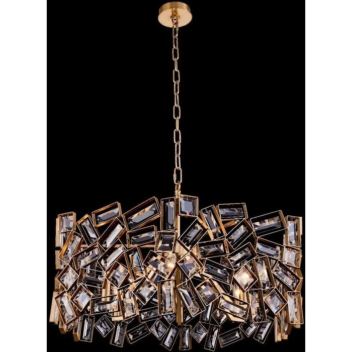 Modular inspired design with a futuristic appeal. The Inclanata collection plays with shapes using classic clear rectangular and square Firenze ™ crystal baguettes in a warm Winter Brass (044) finish.28 in PendantE12 CandelabraDimmable: YDimmer Type: Refer to bulb manuf.Sockets: 6Wattage: 40Lamp Type: E12 CandelabraBulbs Incl#: NoMax Height: 17