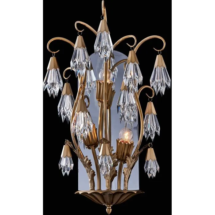 Elegant brass curves create a dynamic growth like movement, while crystal clusters evoke the beauty of morning dew on flower buds. Crafted with spear Firenze crystal tassels and cast solid brass, this unique fixture combines classical chandelier shapes wtWall SconceE26 Medium0Dimmable: YesDimmer Type: Refer to bulb manufacturer for compatibilitySockets: 3Wattage: 40Lamp Type: E26 MediumBulbs Incl#: No Max Height: 26