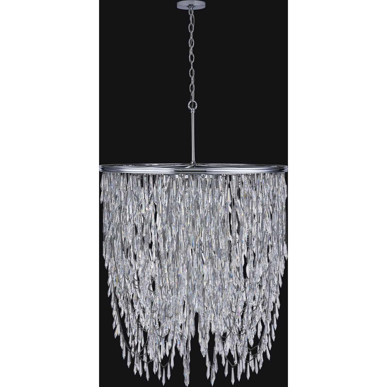 Organized randomness of fringe draping and gravity creates the shape of Frangia. Chains act as the support for the crystal spears for a boho glam vibe. Offered in Allegri’s exclusive Polished Chrome or Brushed Champagne Gold Finishes. _________________ [W34 IN PENDANTE12 Candelabra0Dimmable: YesDimmer Type: Refer to bulb manufacturer for compatibilitySockets: 18Wattage: 40Lamp Type: E12 CandelabraBulbs Incl#: NoMax Height: 50