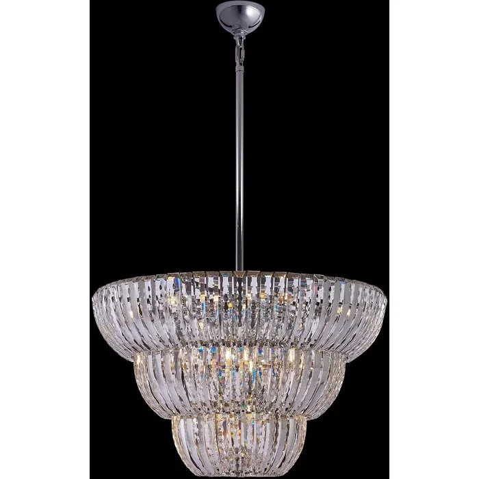 A fusion of modern design curves with the organic ripples in water, captures a harmonious balance between contemporary aesthetics and nature-inspired textures. Meticulously crafted crystals, skillfully cut to achieve the desired effect, showcase our commi30" PendantE12 CandelabraChandelierIncludes (1) 6" (1) 12" and (1) 24" StemsDimmable: YesDimmer Type: Refer to bulb manufacturer for compatibilitySockets: 15Wattage: 40Lamp Type: E12 CandelabraBulbs Incl#: NoMax Height: 30.5