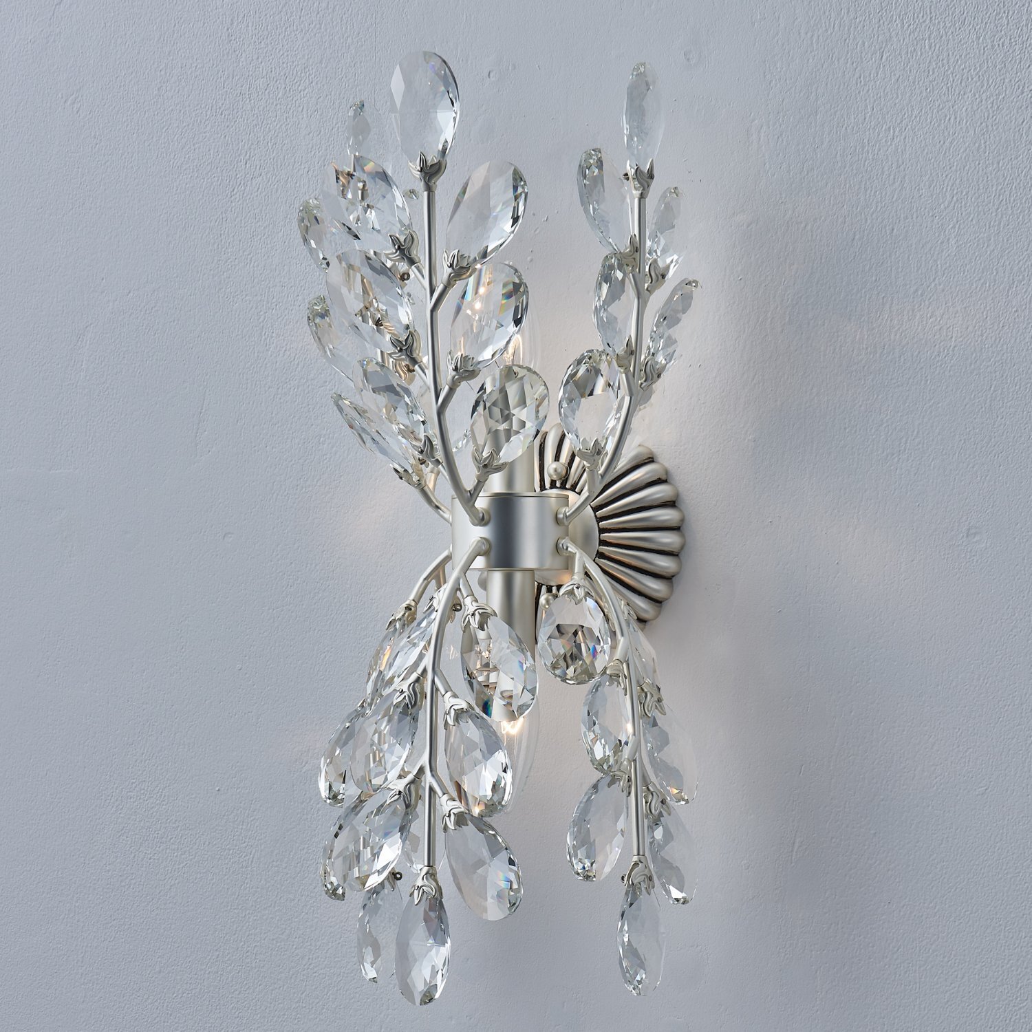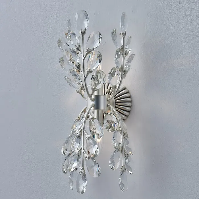 Alloro is a delicate fusion of romance and functionality inspired by vines and elegant leaves. Offered in Clear or Emerald Firenze crystals, this design captures the essence of nature in an enchanting way, adding a touch of whimsical charm to any space. WCLEAR WALL SCONCEE12 Candelabra0Dimmable: YesDimmer Type: Refer to bulb manufacturer for compatibilitySockets: 2Wattage: 40Lamp Type: E12 CandelabraBulbs Incl#: NoMax Height: 18