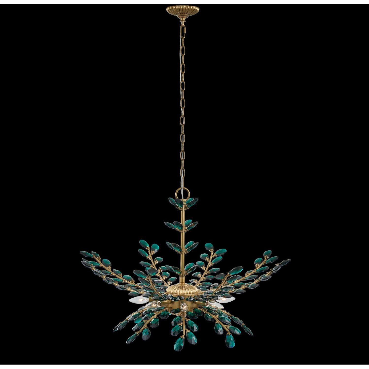 Alloro is a delicate fusion of romance and functionality inspired by vines and elegant leaves. Offered in Clear or Emerald Firenze crystals, this design captures the essence of nature in an enchanting way, adding a touch of whimsical charm to any space. W32 IN GREEN PENDANTE12 Candelabra0Dimmable: YesDimmer Type: Refer to bulb manufacturer for compatibilitySockets: 8Wattage: 40Lamp Type: E12 CandelabraBulbs Incl#: NoMax Height: 22.5