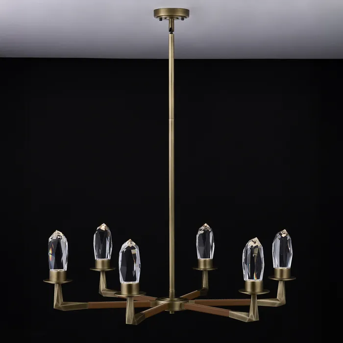 The Misto Collection seamlessly blends three exquisite materials to form intricate, architecturally inspired decorative lighting. Featuring premium brass, crystal, and genuine leather, this collection transcends ordinary lighting fixtures. The leather acc6 LT LED CHANDELIERLED(1)6 (1)12 (1)24 STEM KIT INCLUDEDDimmable: YesDimmer Type: Triac (Dimmer Not Included)Wattage: 6Lamp Type: LEDColor Rendering Index (CRI): 90Bulbs Incl#: YesCorrelated Color Temperature (K): 3000Lumens (Lm): 2520