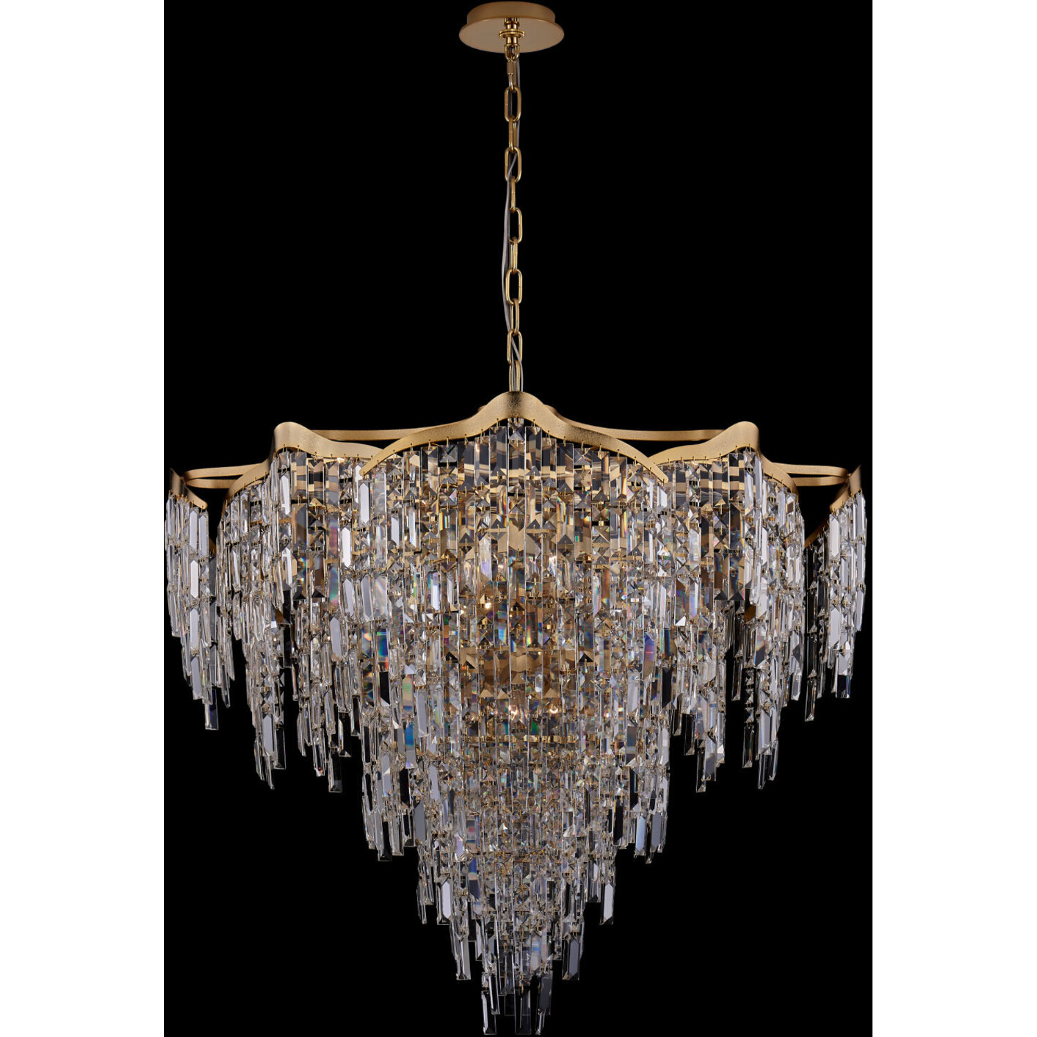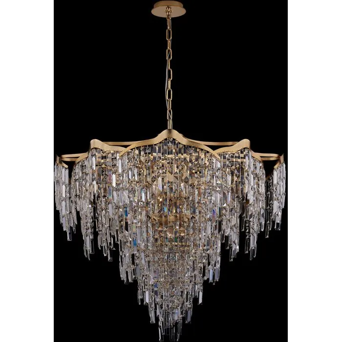 The Cadere Collection captivates the eye and sparks intrigue with its mesmerizing visual texture. Drawing inspiration from cascading waterfalls, this collection showcases vertical Firenze Crystals suspended from an undulating steel frame. Elegantly finish40 IN CHANDELIERE12 Candelabra0Dimmable: YesDimmer Type: Refer to bulb manufacturer for compatibilitySockets: 24Wattage: 40Lamp Type: E12 CandelabraBulbs Incl#: NoMax Height: 33
